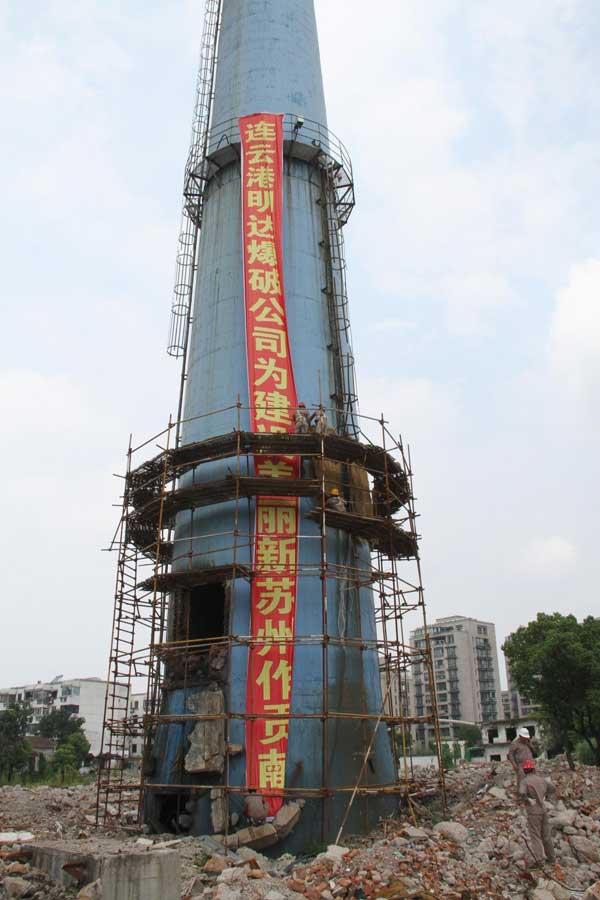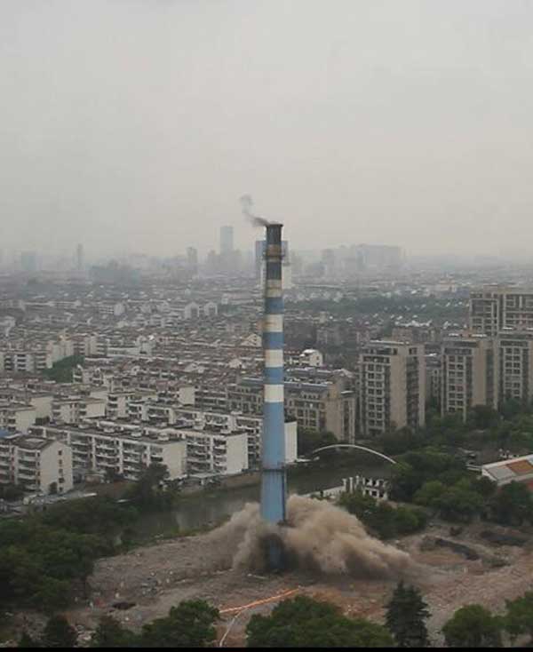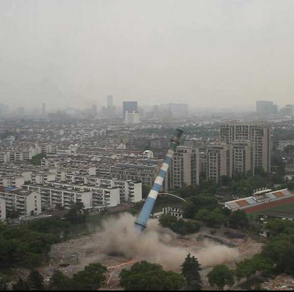 苏州市地标建筑之一,矗立在苏州城南的苏州热电厂大烟囱,该烟囱高80m,周围有小区、学校、高架桥、小商品市场,爆破环境复杂。我公司技术人员仔细勘察现场后,编制详细的爆破方案。最终于2016年8月26日下午3点整实施爆破拆除,伴随苏州人33年的电热厂大烟囱从此成为历史。